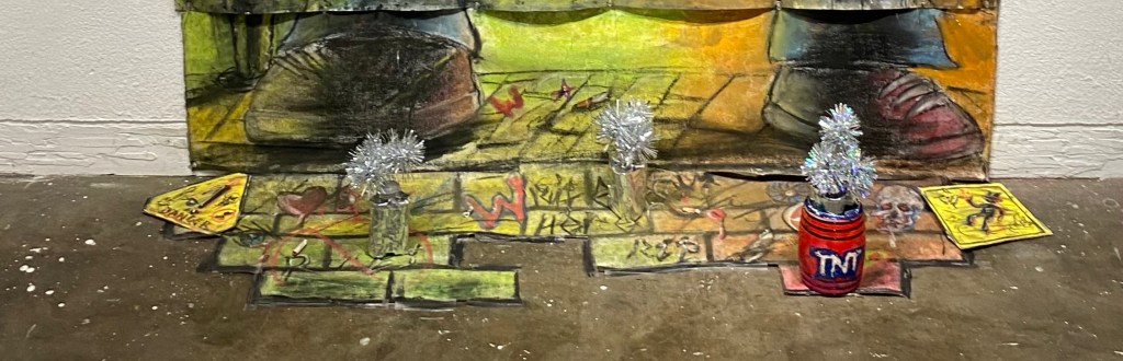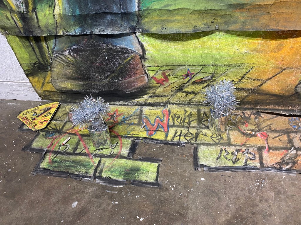 My final project as an undergraduate and one of my most ambitious. The sequel to Town Now Territory (2022). For this follow up, i wanted to make both a drawing and an installation depicting the youth marking their territory with fireworks. Homemade firework props fill in the installation for a more immersive experience.
